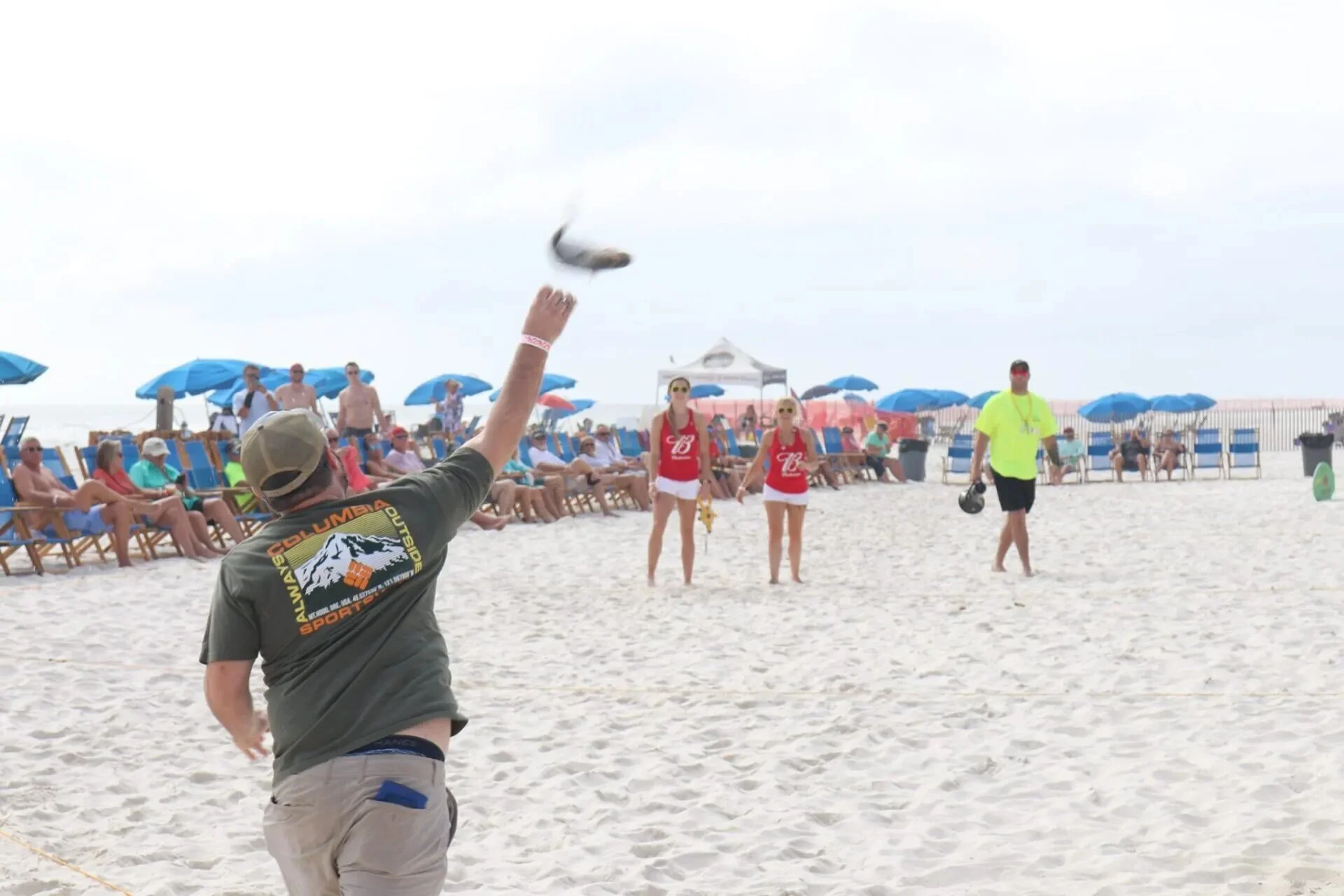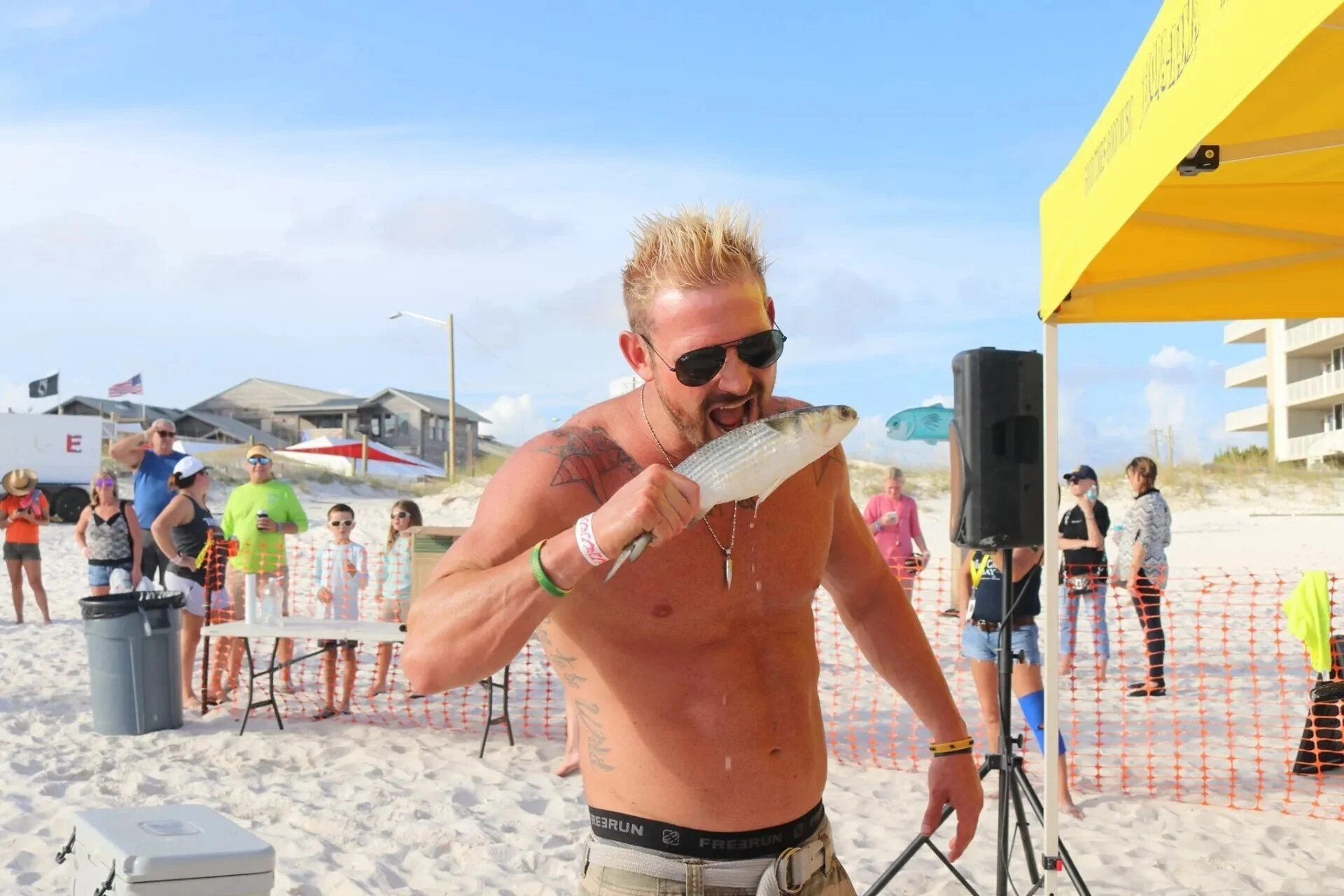 The event is held directly on the beach behind the Flora-Bama, with participants throwing a mullet fish across the state line from Florida into Alabama.