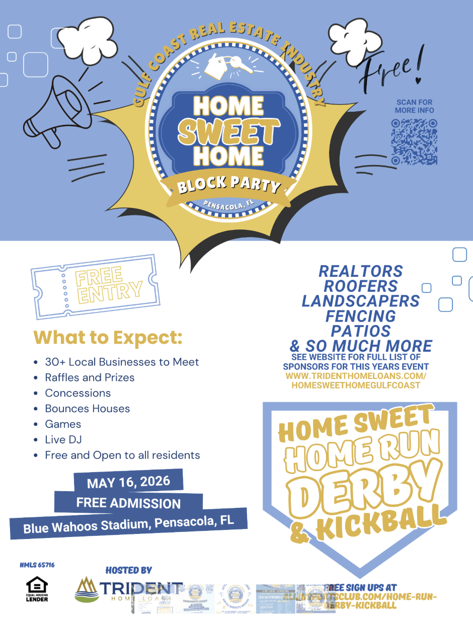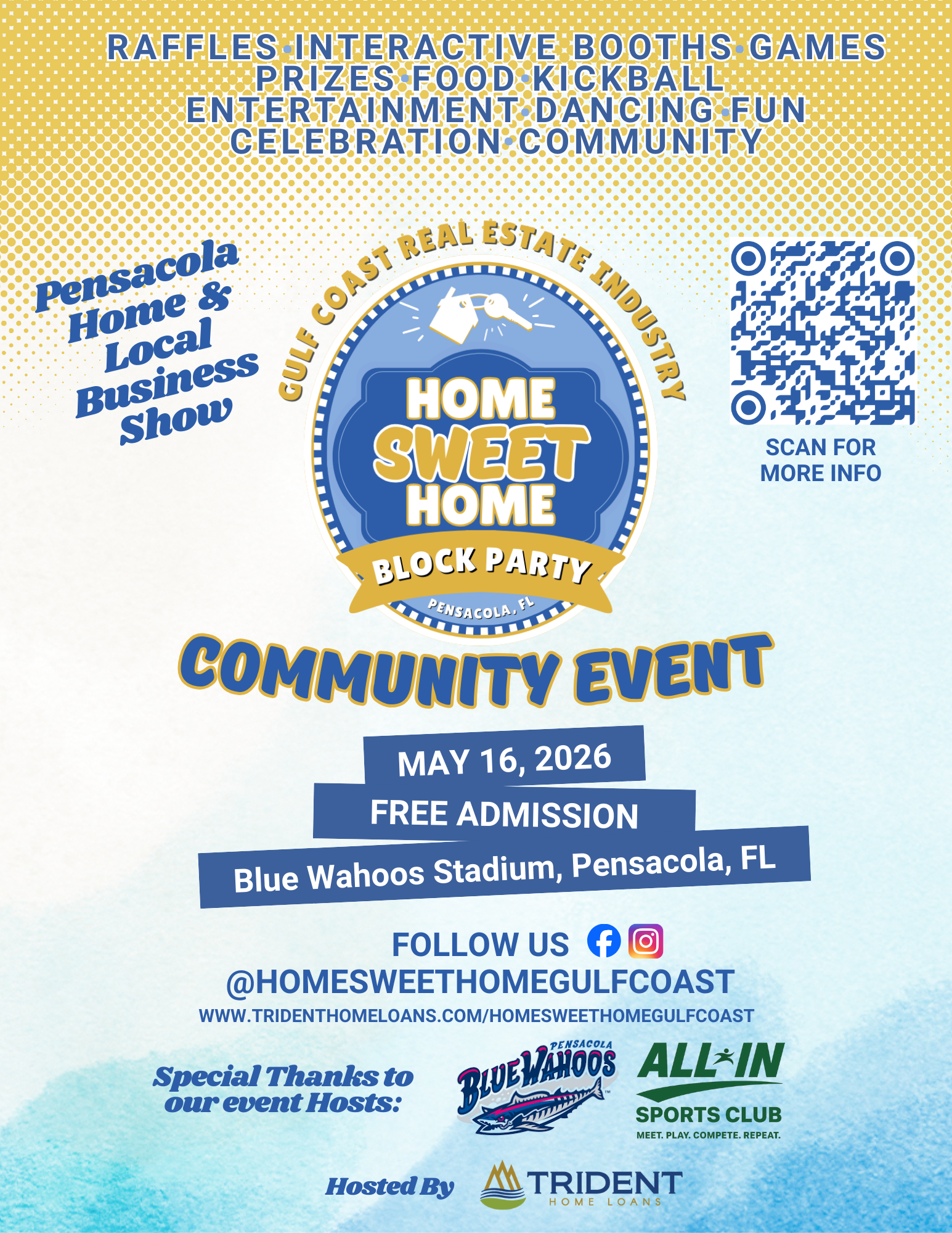 This event is proudly presented by Trident Home Loans, bringing the Home Sweet Home Block Party to Pensacola with local vendors, activities, and community fun for all ages.
