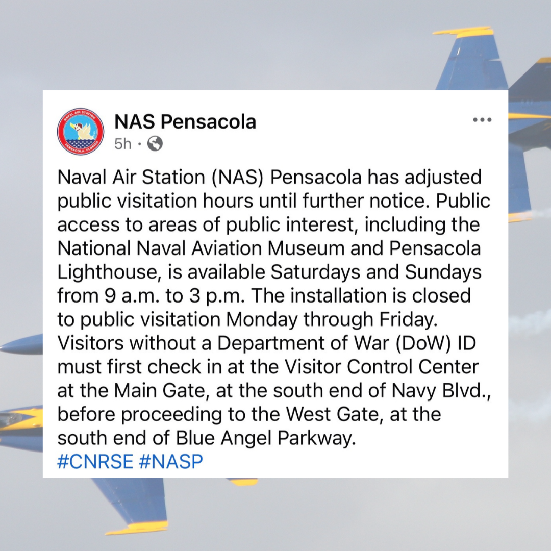 Become a sponsorNaval Air Station Pensacola has announced updated public access hours, affecting some of the area’s most popular attractions including the National Naval Aviation Museum and Pensacola Lighthouse.