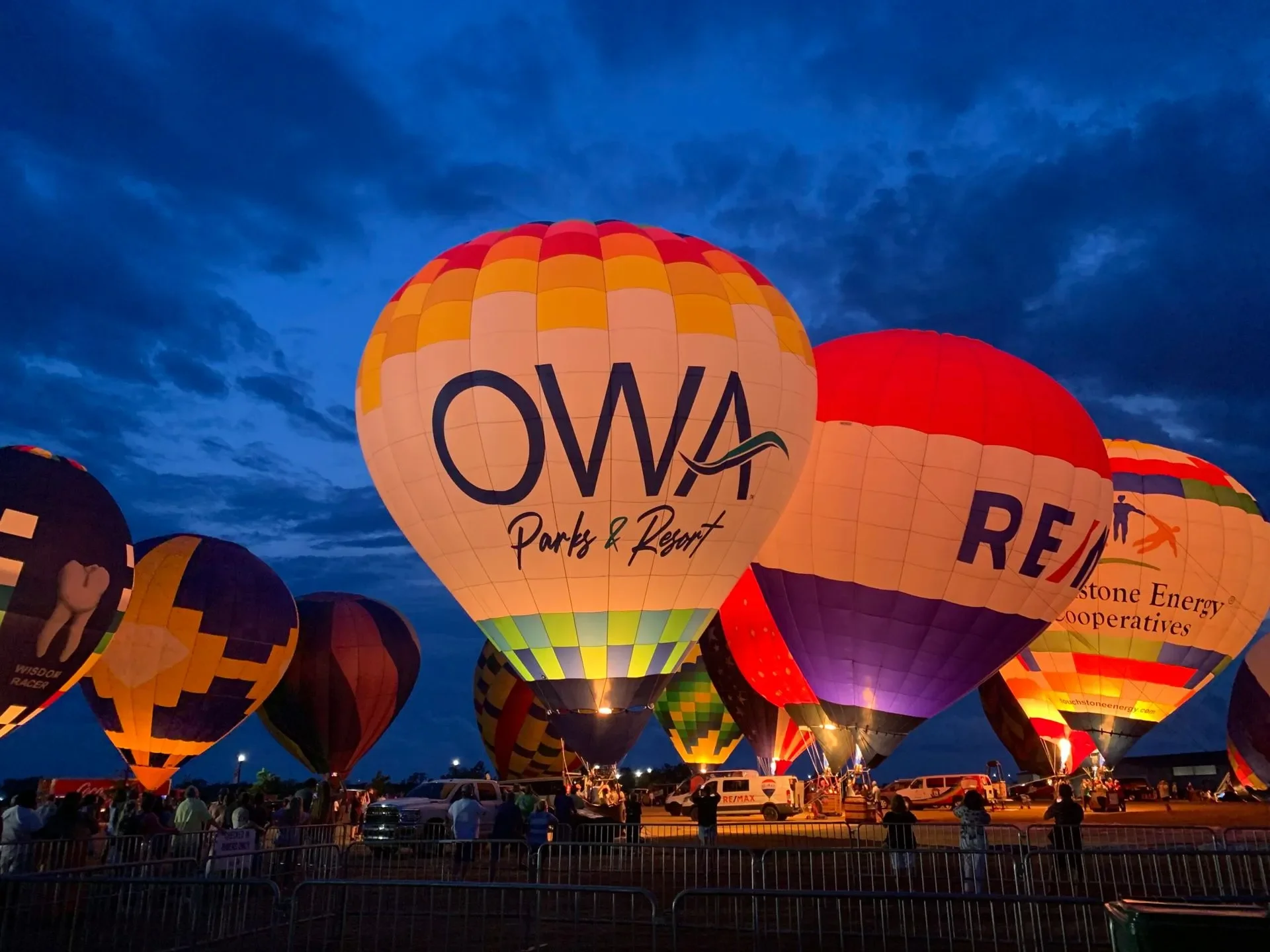 The festival includes balloon glows, tethered rides, food vendors, and live entertainment.